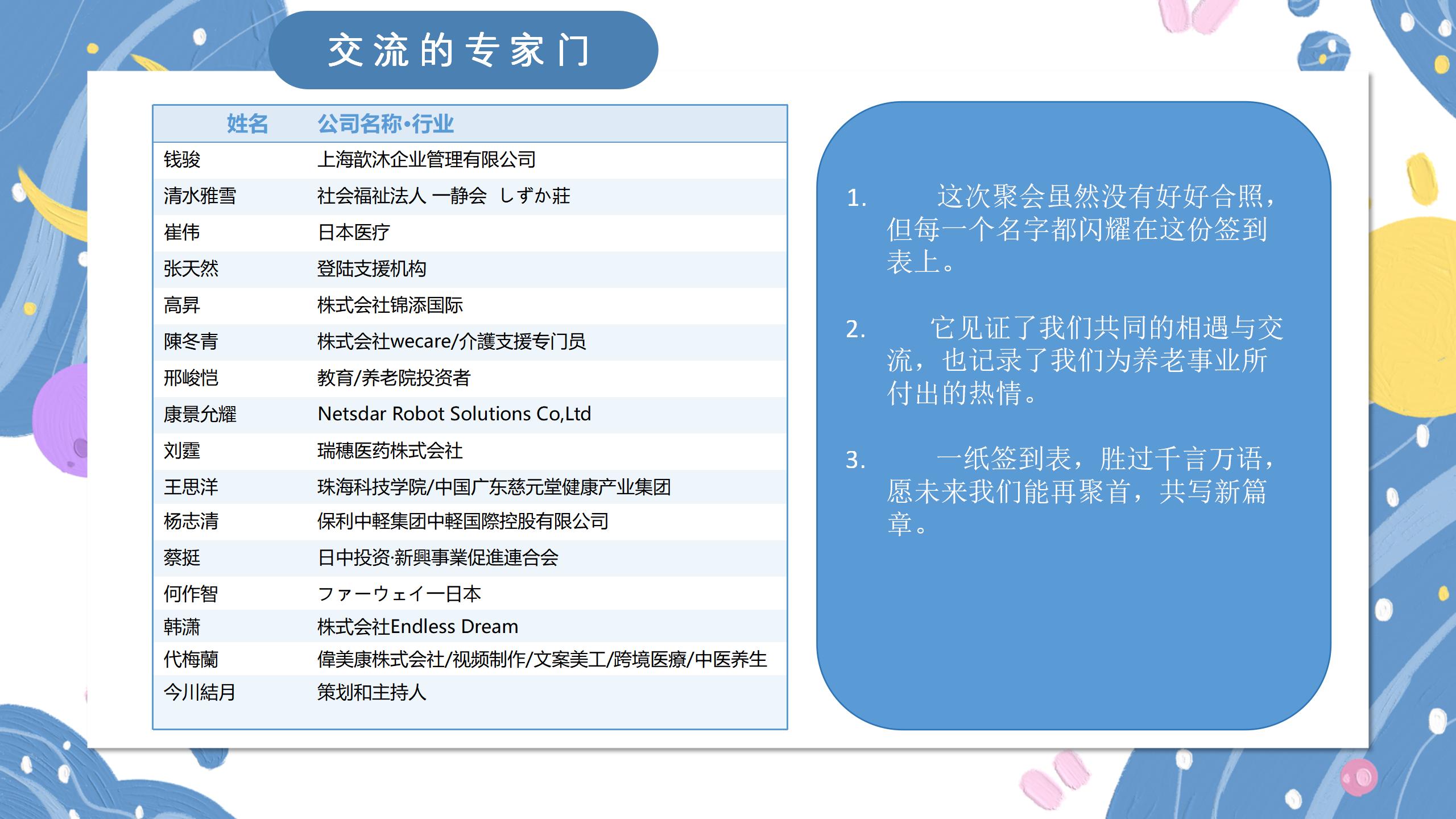 在智能机器人与辅助设备等前沿技术的应用方面,我们期待在未来的交流会中,能以此为主题展开更深入的探讨,与各位与会专家共同探索科技赋能养老的新路径。