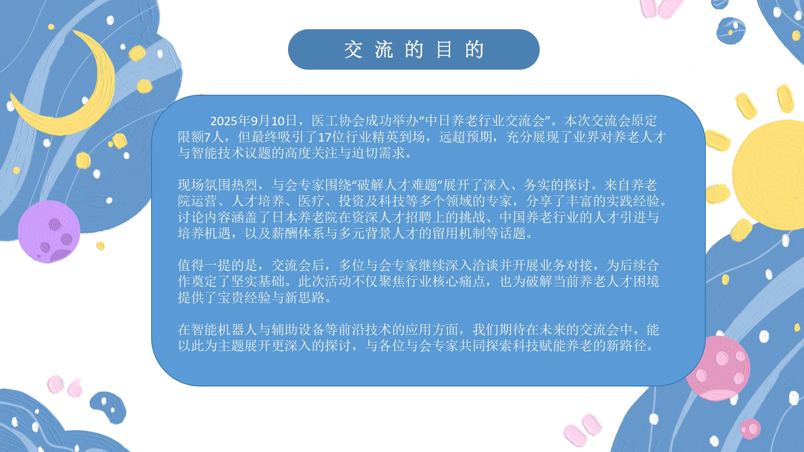 9月10日,医工协会成功举办“中日养老行业交流会”。本次交流会原定限额7人,但最终吸引了17位行业精英到场,远超预期,充分展现了业界对养老人才与智能技术议题的高度关注与迫切需求。