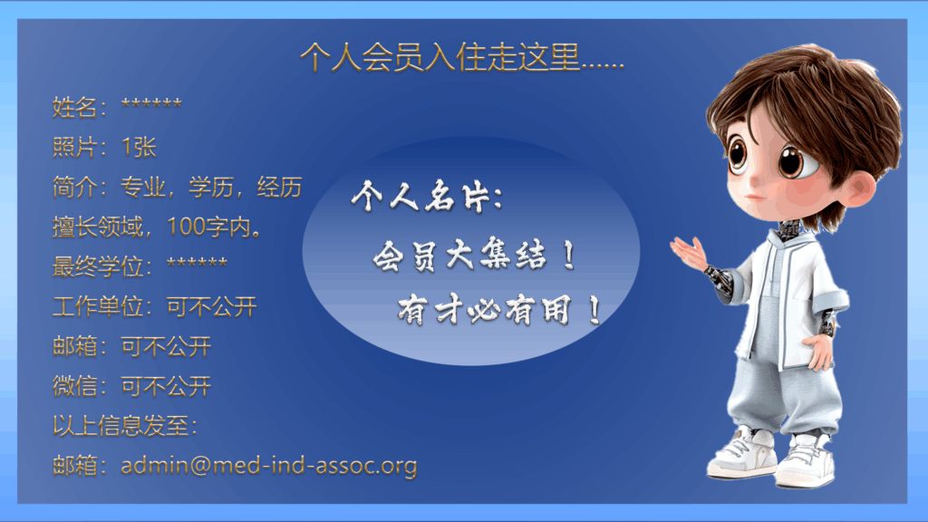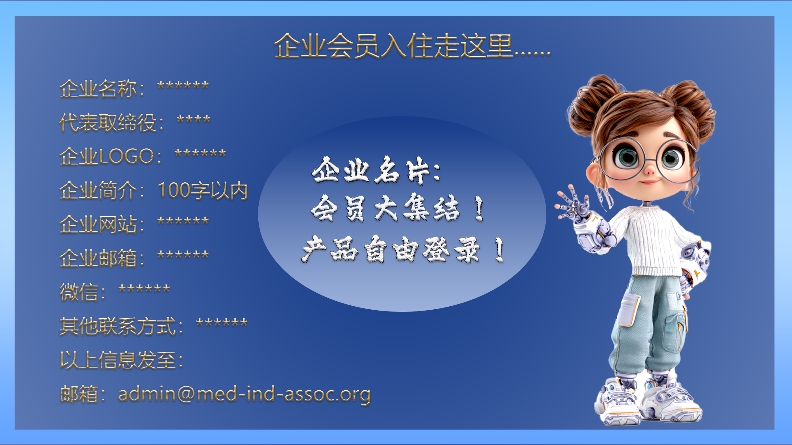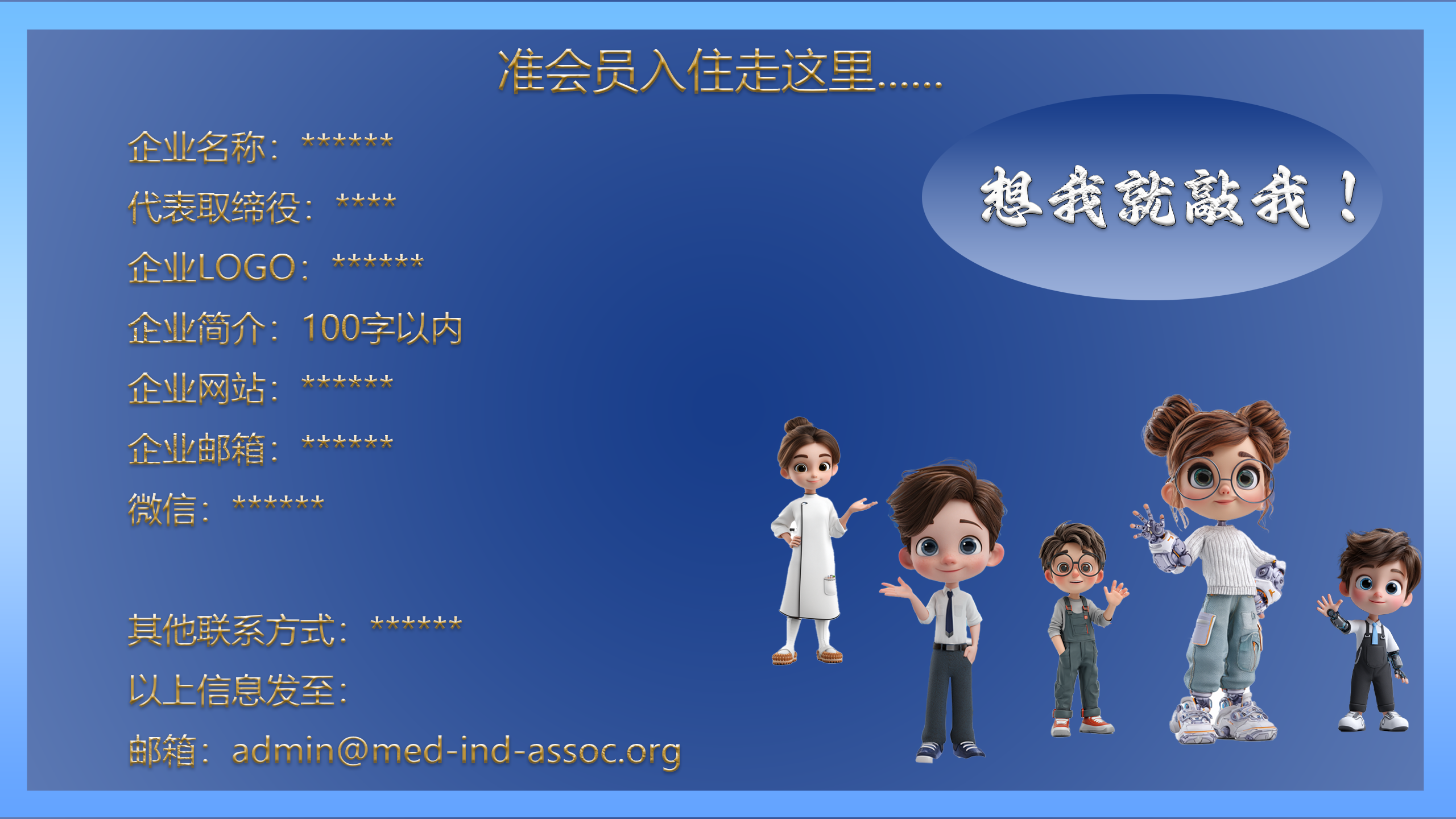 企业会员入住复制信息:企业名称:******代表取缔役:****企业LOGO:******企业简介:100字以内企业网站:******企业邮箱:******微信:******其他联系方式:******以上信息发至: 邮箱:admin@med-ind-assoc.org |